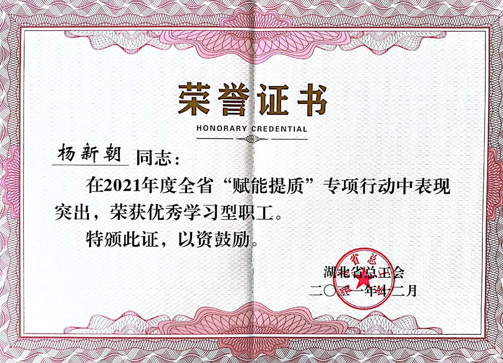 • 楊新朝榮獲2021年度湖北省賦能提質(zhì)優(yōu)秀學(xué)習(xí)型職工稱號(hào)