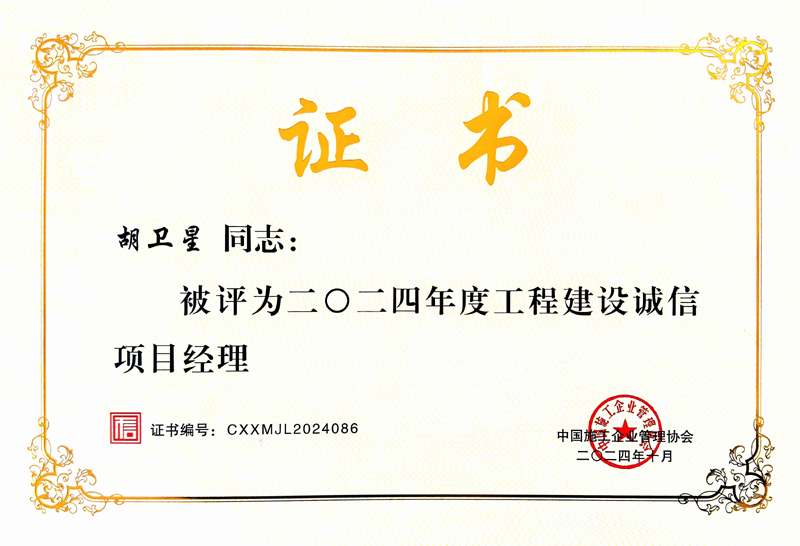• 集團(tuán)公司項(xiàng)目經(jīng)理胡衛(wèi)星獲評(píng)二○二四年度工程建設(shè)誠(chéng)信項(xiàng)目經(jīng)理榮譽(yù)稱號(hào)