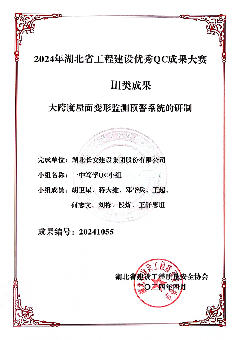 • 英山一中篤學(xué)QC小組《大跨度屋面變形監(jiān)測預(yù)警系統(tǒng)的研制》、順鮮項目QC小組《研究一種新型地下水防滲施工方法》獲評2024年湖北省工程建設(shè)優(yōu)秀QC成果大賽Ⅲ類成果
