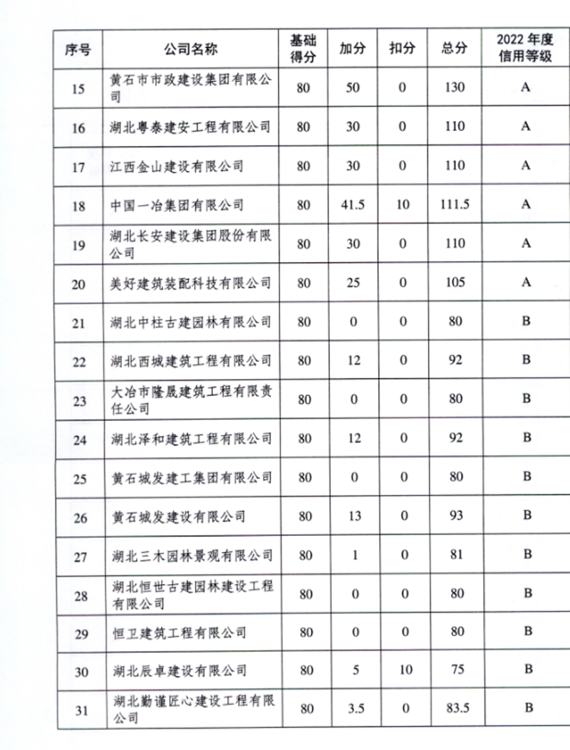 集團(tuán)公司被黃石市住建局評為建筑市場主體信用A級單位