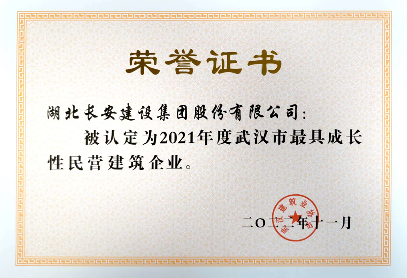 湖北長安建設集團榮獲2020年度武漢市最具成長性民營建筑企業(yè)榮譽稱號