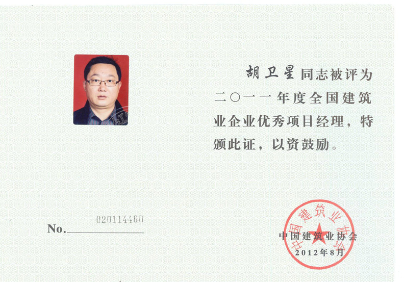 2011年度全國建筑業(yè)企業(yè)優(yōu)秀項(xiàng)目經(jīng)理(胡衛(wèi)星)