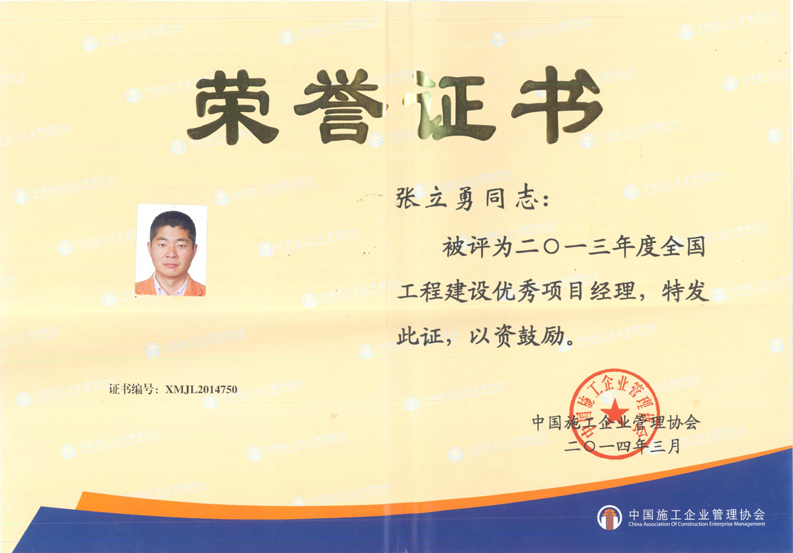 2013年度全國工程建設(shè)優(yōu)秀項(xiàng)目經(jīng)理(張立勇)
