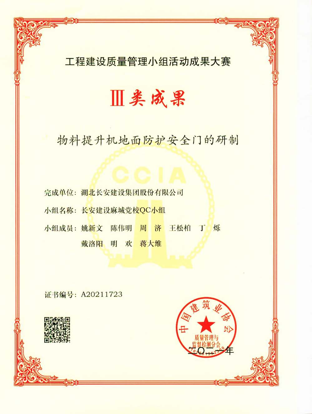 物料提升機(jī)地面防護(hù)安全門(mén)的研制榮獲工程建設(shè)質(zhì)量小組活動(dòng)成果大賽Ⅲ類(lèi)成果