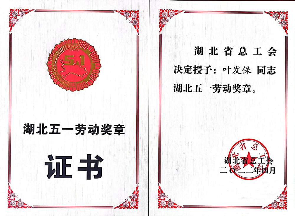 湖北省總工會(huì)授予集團(tuán)總經(jīng)理葉發(fā)?!拔逡粍趧?dòng)獎(jiǎng)?wù)隆惫鈽s稱號(hào)