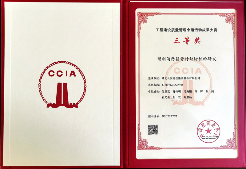 預制消防箱背襯封堵板的研發(fā)榮獲工程建設質量管理小組活動成果大賽三等獎(國家級)