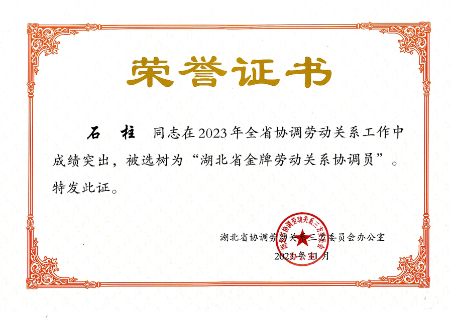 石柱被選樹為“湖北省金牌勞動關(guān)系協(xié)調(diào)員”
