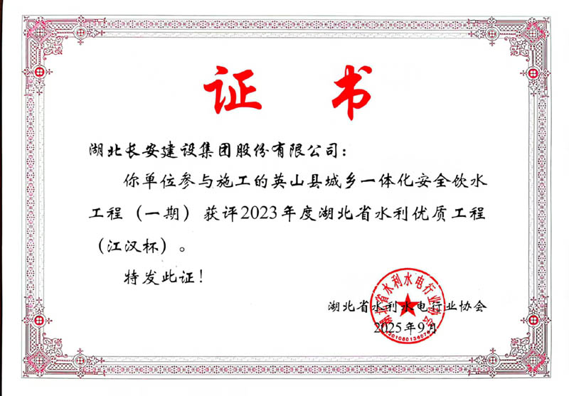 英山縣城鄉(xiāng)一體化安全飲水工程(一期)獲評(píng)2023年度湖北省水利優(yōu)質(zhì)工程(江漢杯)