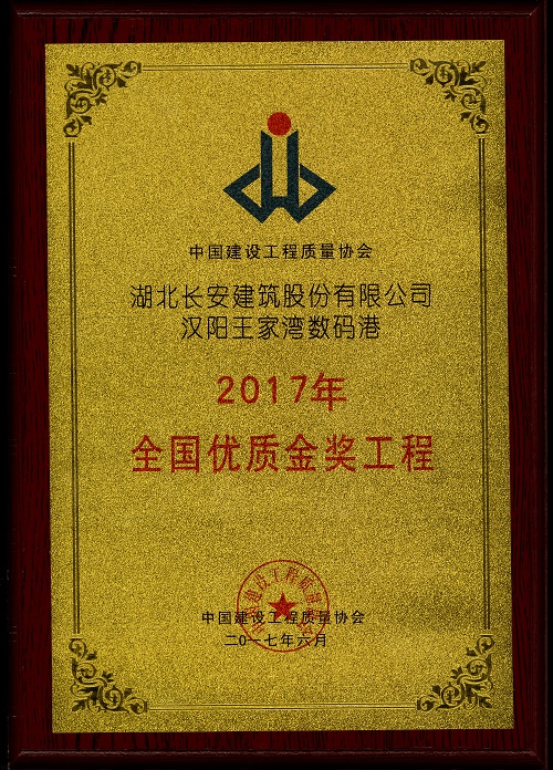 漢陽王家灣數(shù)碼港工程被評為“2017年全國優(yōu)質(zhì)金獎工程”獎牌
