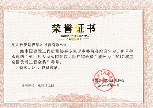 英山縣人民醫(yī)院住院、醫(yī)療綜合樓被評為2017年度全國優(yōu)質(zhì)工程金獎