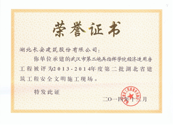 武漢市第二炮兵指揮學(xué)院經(jīng)濟(jì)適用房被評為2013-2014年度省建筑工程安全文明施工現(xiàn)場