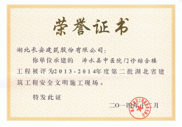 浠水中醫(yī)院門診綜合樓被評為2013-2014年度省建筑工程安全文明施工現(xiàn)場