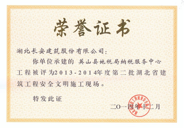 英山縣地稅局納稅服務(wù)中心被評為2013-2014年度省建筑工程安全文明施工現(xiàn)場