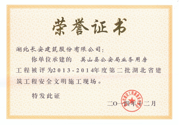 英山縣公安局業(yè)務(wù)用房被評為2013-2014年度省建筑工程安全文明施工現(xiàn)場