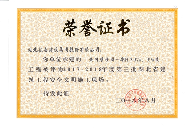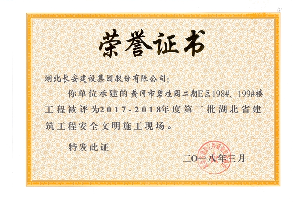 黃岡碧桂園二期E區(qū)工程(200#樓、201#樓、202#樓、203#樓)工程被評為2017-2018年度第三批湖北省建筑工程安全文明施工現(xiàn)場