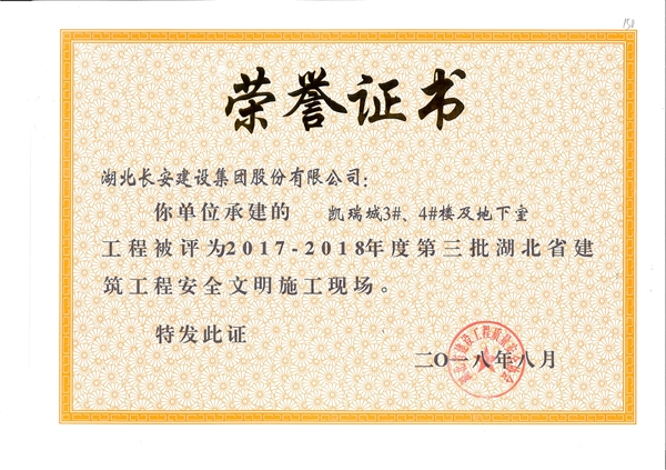 凱瑞城(3#、4#)樓及地下室工程被評為2017-2018年度第三批湖北省建筑工程安全文明施工現(xiàn)場