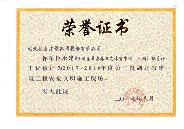 蘄春縣奧林匹克體育中心(一期)體育場工程被評為2017-2018年度第三批湖北省建筑工程安全文明施工現(xiàn)場