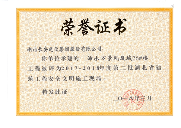 浠水萬景鳳凰城3#樓工程被評為2017-2018年度第三批湖北省建筑工程安全文明施工現(xiàn)場