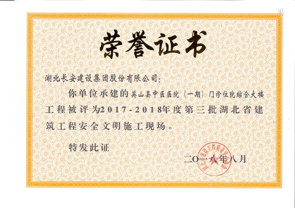 英山縣中醫(yī)醫(yī)院(一期)門診住院綜合大樓工程被評為2017-2018年度第三批湖北省建筑工程安全文明施工現(xiàn)場