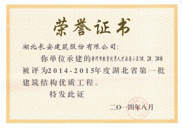 黃岡市教育優(yōu)秀人才安居小區(qū)1、2、3#樓被評為2014-2015年度省建筑結(jié)構(gòu)優(yōu)質(zhì)工程