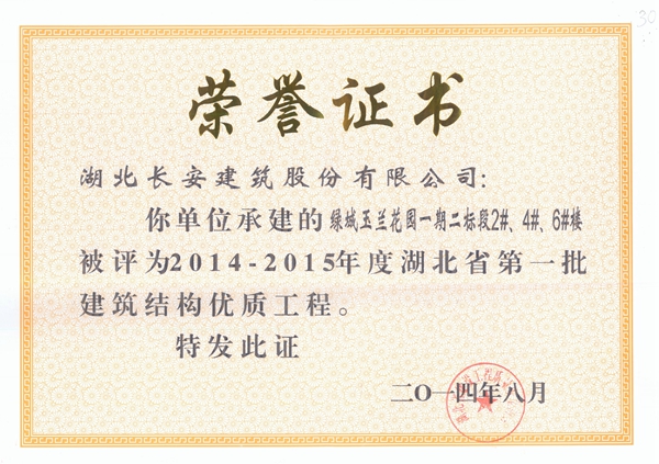 綠城玉蘭花園一期二標(biāo)段2、4、6#樓被評為2014-2015年度省建筑結(jié)構(gòu)優(yōu)質(zhì)工程