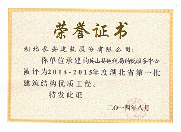 英山縣地稅局納稅服務(wù)中心被評為2014-2015年度省建筑結(jié)構(gòu)優(yōu)質(zhì)
