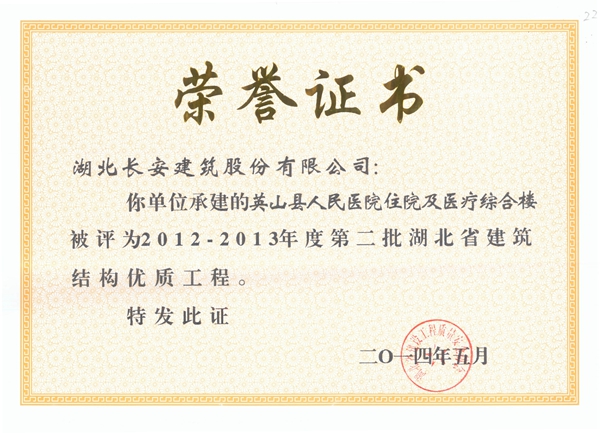 英山縣人民醫(yī)院住院及醫(yī)療綜合樓被評為2012-2013年度省建筑結(jié)構(gòu)優(yōu)質(zhì)工程