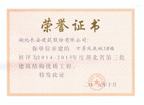 萬景鳳凰城1號樓建筑結(jié)構(gòu)優(yōu)質(zhì)證書