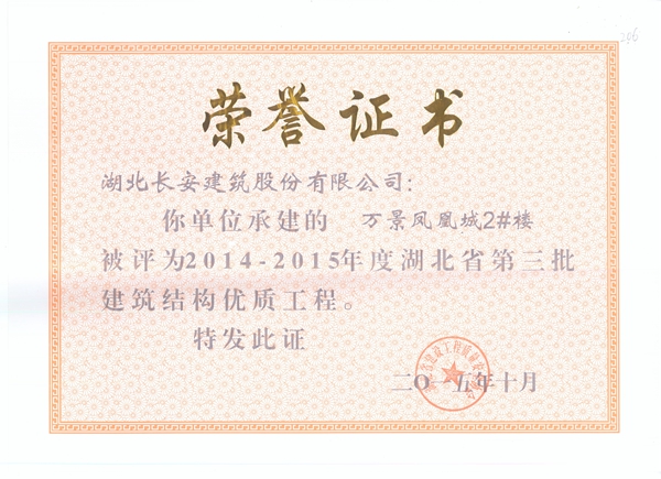 萬景鳳凰城2號樓建筑結(jié)構(gòu)優(yōu)質(zhì)證書