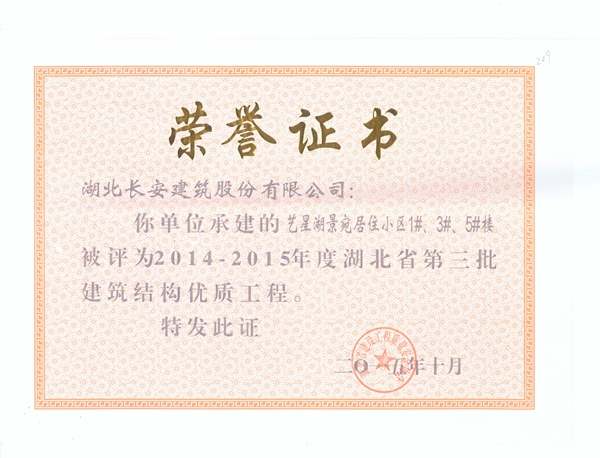 藝星湖景苑居小區(qū)1、3、5號樓建筑結(jié)構(gòu)優(yōu)質(zhì)證書