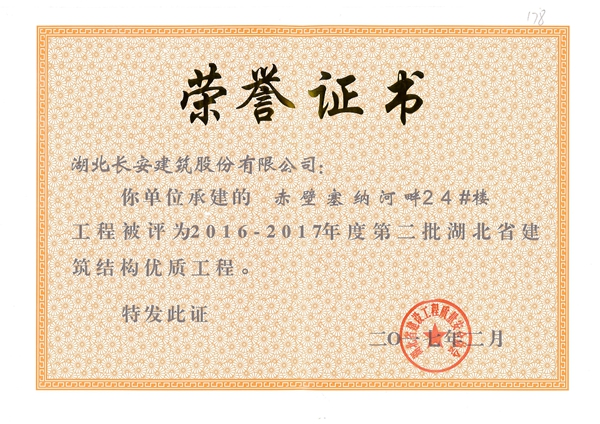 赤壁塞納河畔二期24#樓被評為2016-2017年度第二批湖北省第二批省結構優(yōu)質(zhì)工程([2017]4號)