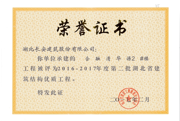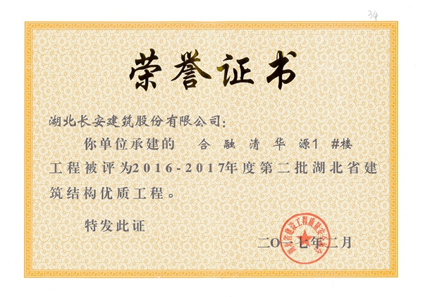 合融清華1#樓被評為2016-2017年度第二批湖北省第二批省結構優(yōu)質(zhì)工程([2017]4號)