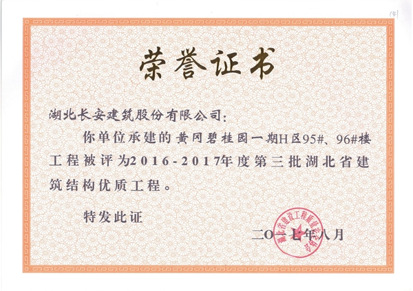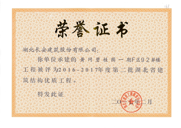 黃岡碧桂園一期F區(qū)92#樓評為2016-2017年度第二批湖北省第二批省結構優(yōu)質(zhì)工程([2017]4號)