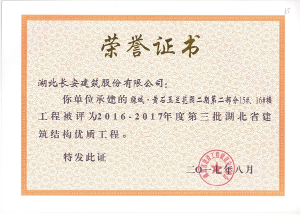 綠城黃石玉蘭花園二期第二部分15、16#樓被評為2016-2017年度第三批省結構優(yōu)質(zhì)