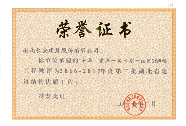 升華翡翠一品二期一組團26#樓評為2016-2017年度第二批湖北省第二批省結構優(yōu)質(zhì)工程([2017]4號)