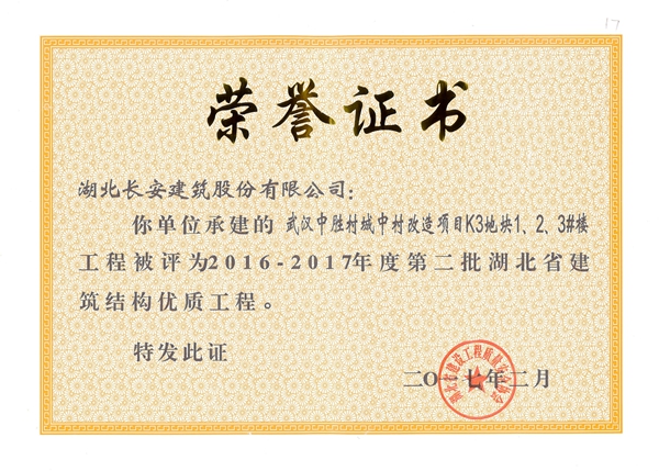 武漢中勝村城中村改造項目K3地塊1、2、3#樓被評為2016-2017年度第二批湖北省第二批省結構優(yōu)質(zhì)工程([2017]4號)