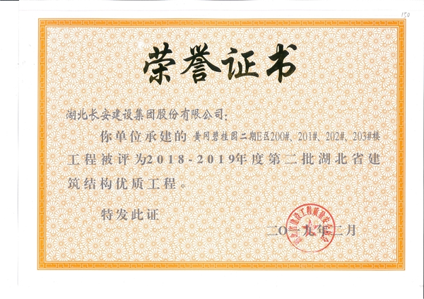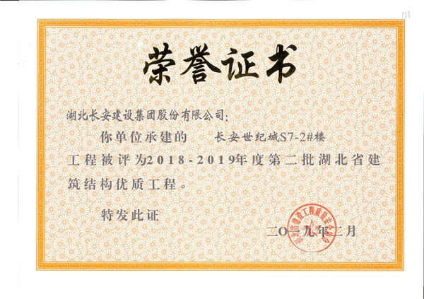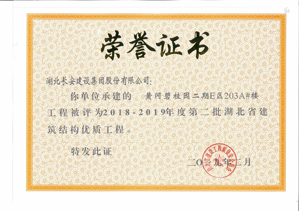 黃岡碧桂園二期E區(qū)203A#樓工程被評為2018-2019年度第二批省結(jié)構(gòu)優(yōu)質(zhì)工程