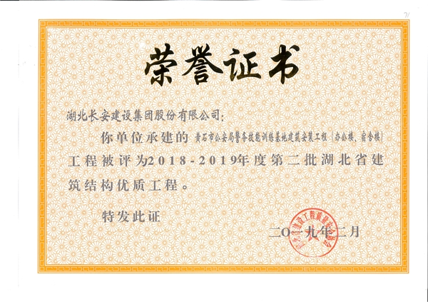 黃石市公安局警務技能訓練基地建筑安裝工程(辦公樓、宿舍樓)工程被評為2018-2019年度第二批省結(jié)構(gòu)優(yōu)質(zhì)工程