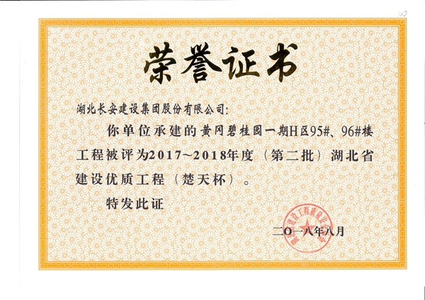 黃岡碧桂園一期H區(qū)(95#、96#)樓工程被評為2017-2018年度(第二批)湖北省建設(shè)優(yōu)質(zhì)工程(楚天杯)