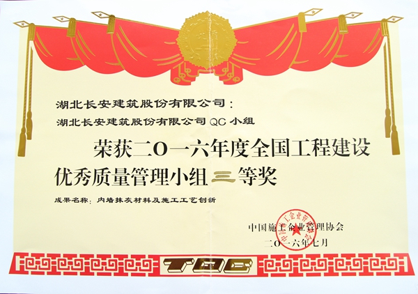 公司及QC小組榮獲2016年度全國(guó)工程建設(shè)優(yōu)秀質(zhì)量管理小組三等獎(jiǎng)(內(nèi)墻抹灰材料及施工工藝創(chuàng)新)獎(jiǎng)牌