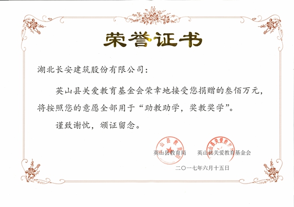 捐贈英山縣關愛教育基金會300萬用于“助教助學,獎教獎學”2017