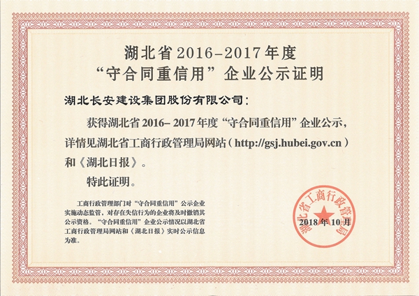(大證)湖北省2016-2017年度“守合同重信用”企業(yè)公示證明2018