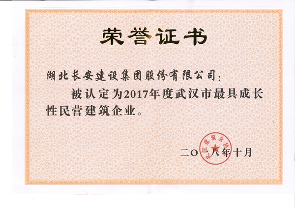 2017年度武漢市最具成長(zhǎng)性民營(yíng)建筑企業(yè)(證書(shū))