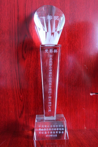 全縣民營(yíng)企業(yè)紀(jì)念改革開(kāi)放40周年“光彩杯”演講大賽中榮獲一等獎(jiǎng)(獎(jiǎng)杯)
