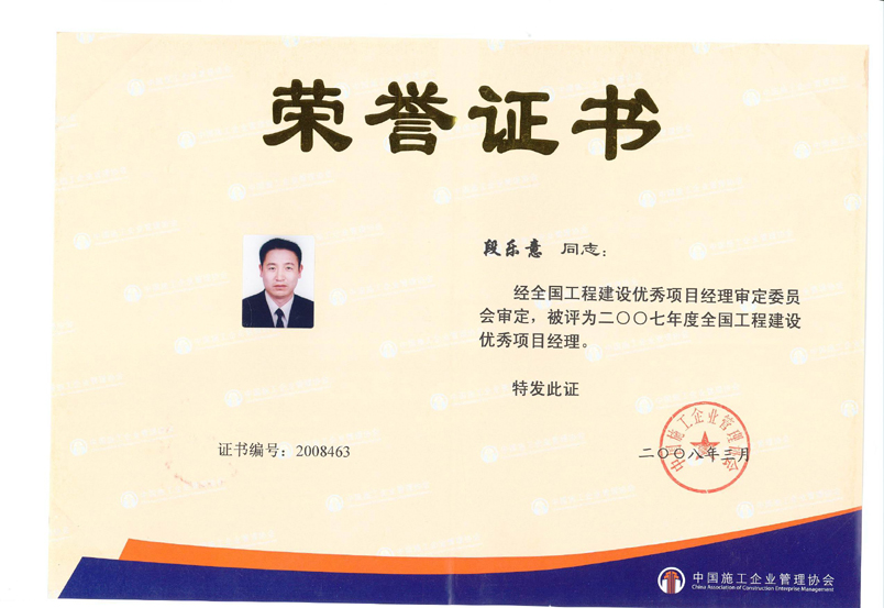 2007年度全國(guó)工程建設(shè)優(yōu)秀項(xiàng)目經(jīng)理(段樂(lè)意)