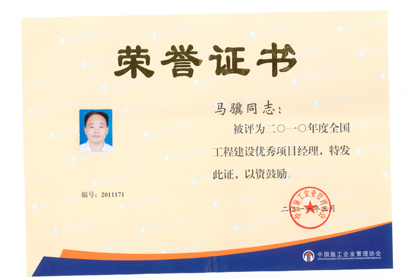 2010年度全國工程建設(shè)優(yōu)秀項目經(jīng)理(馬驥)