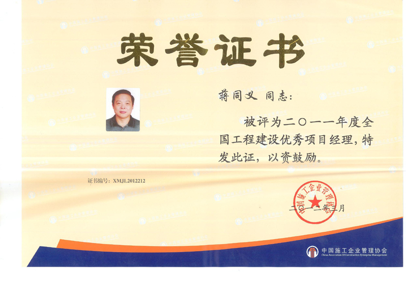 2011年度全國工程建設(shè)優(yōu)秀項目經(jīng)理(蔣同義)