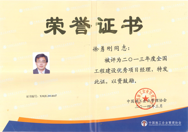 2013年度全國(guó)工程建設(shè)優(yōu)秀項(xiàng)目經(jīng)理(徐勇剛)