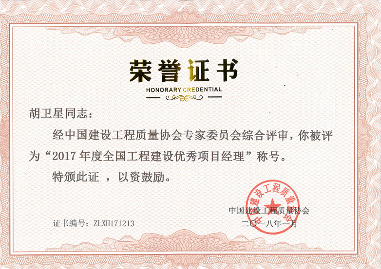 2017年度全國(guó)工程建設(shè)優(yōu)秀項(xiàng)目經(jīng)理(胡衛(wèi)星)