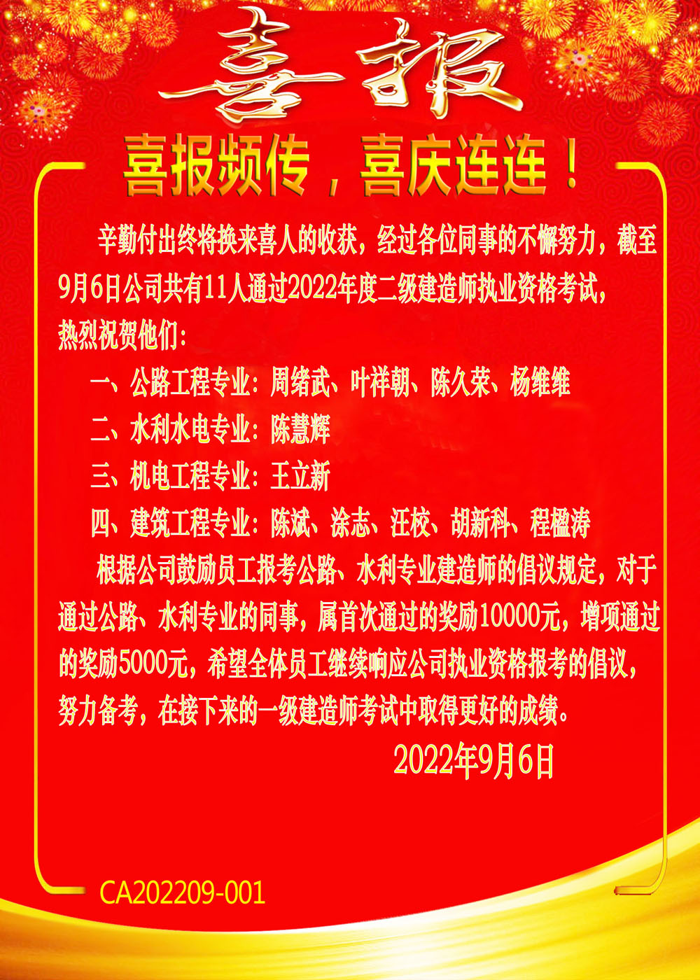 日前,二級建造師執(zhí)業(yè)資格考試名單公布,公司周緒武、葉祥朝等11人順利通過考試,獲得二級建造師執(zhí)業(yè)資格證書。希望全體員工積極響應(yīng)公司執(zhí)業(yè)資質(zhì)報(bào)考倡議,努力學(xué)習(xí),積極備考,以實(shí)際行動(dòng)和優(yōu)異成績助力公司高質(zhì)量穩(wěn)健發(fā)展。